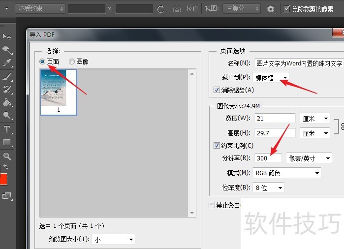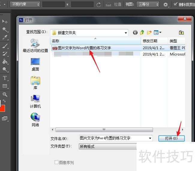 启动PS后双击空白区域,选择打开文件,定位到已保存的PDF文档并点击打开即可。