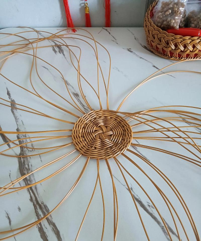 2、从底部开始编,打好牢固基础先编筐底,这是关键,取几根主条,交叉放好,像米字一样,然后拿细条,一上一下穿,绕着中心编,这叫压一挑一,编成圆盘状,慢慢往外扩,边编边调整,保持形状圆,底部要编紧,这样才结实,能承重东西。