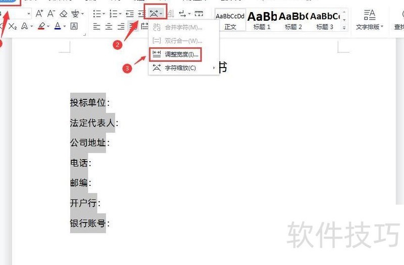 首先选中第一行文字,再按住Ctrl键并依次选中其他需要对齐的上下行文字,注意不要选中文字末尾的标点符号(所示)。接着,点击菜单栏中的,在下拉选项中选择功能(所示)。随后会弹出调整宽度对话框,在显示为若干字符时,将也设置为相同的字符数,最后点击确定按钮即可完成对齐操作。