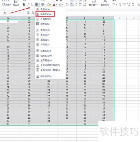 打开开始菜单,点击边框线,选择全部框线选项。