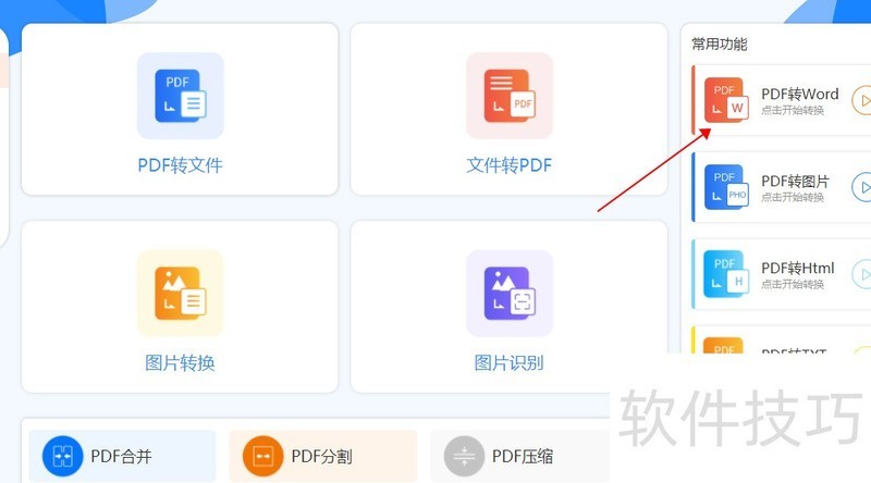 该工具支持批量文件转换,效率高。进入首页后,点击右侧第一个PDF转Word功能即可使用。