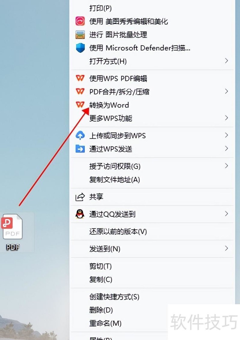 在桌面找到PDF文件,右键点击,选择转换为Word即可完成操作。