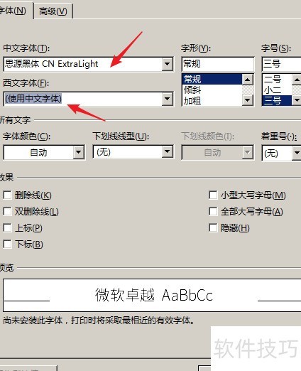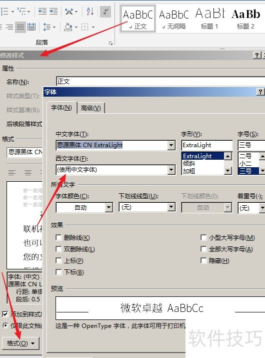 为何如此?查看正文样式字体设置,可见西文字体选项设为使用中文字体。