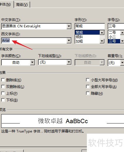 一旦设定字体,文档中的英文和数字即显示为所选英文字体。