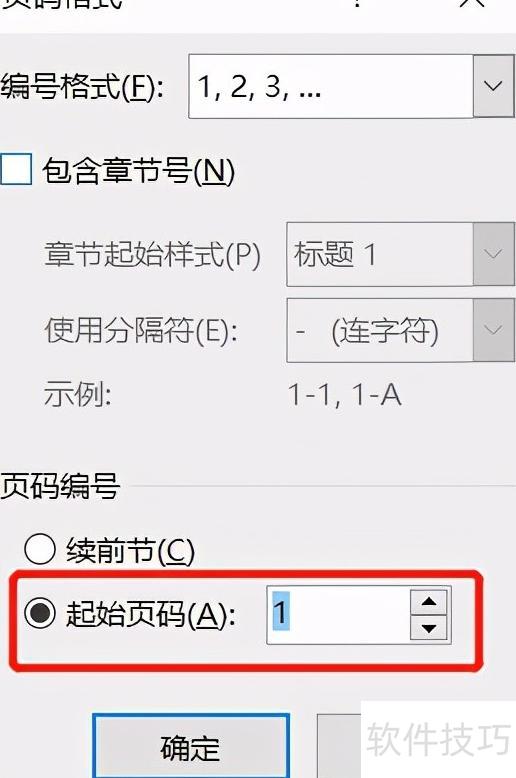 在页码格式设置中,选择起始页码并将其数值设为1。