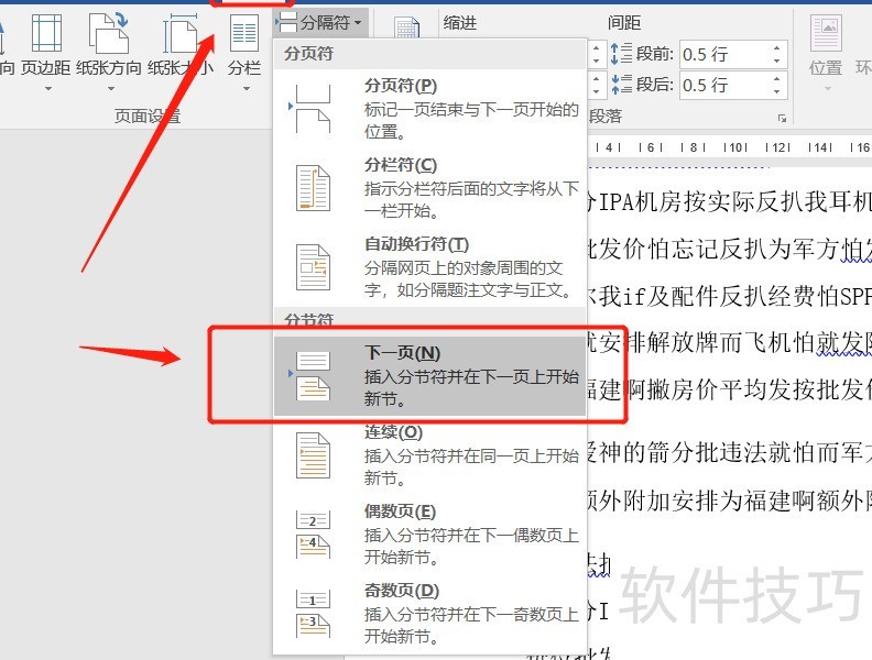 将光标移至目标页前一页末尾,依次选择布局→分隔符→下一页,插入分节符以设置新页码。