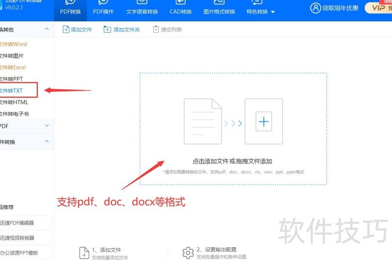 打开迅捷PDF转换器界面,点击左侧文件转TXT选项,系统支持PDF、DOC和DOCX等多种格式,其中DOC与DOCX即为Word文档。