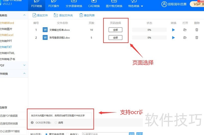 页码选择可手动指定需转换的页面,系统默认转换全部页面。
