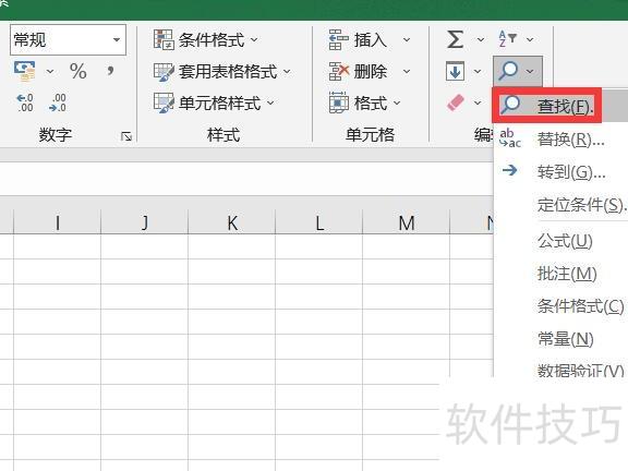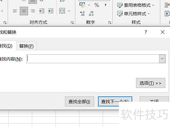 查找的快捷键为Ctrl+F,也可通过点击开始菜单栏中编辑功能区的查找和选择,在下拉菜单中选择查找功能。执行后将弹出查找和替换窗口,该窗口分为查找与替换两个区域。默认情况下,查找部分仅显示输入查找内容的框体,并隐藏选项设置;点击选项按钮后,即可展开完整的查找对话框,呈现更多搜索参数设置。