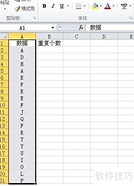 在A1至A21单元格内有一列数据,现需统计每个数据的重复次数,并将结果填入B列对应位置。