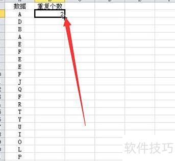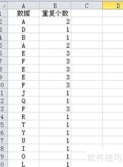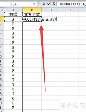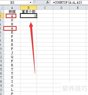 在B2单元格中输入公式:=COUNTIF(A:A,A2),按回车键确认,即可在B2显示A2数据在A列中的重复次数,所示。此操作可快速统计指定内容在整个A列中的出现频次。