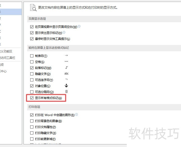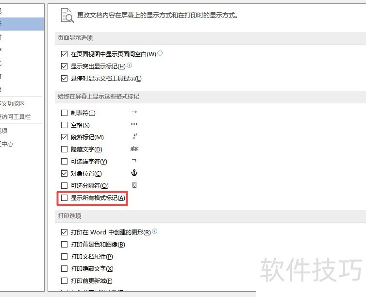 第五步,软件将弹出Word选项窗口,在左侧列表中找到并点击显示选项。