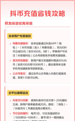 3、参与平台活动获取抖币,有时能省则省除了直接花钱买,其实还有别的办法,抖音经常会举办各种活动,比如看直播任务,完成每日签到,或者参与话题挑战,这些活动,有时会奖励一些抖币,虽然数量可能不多,但积少成多嘛,也是一种乐趣,另外,关注官方账号也很重要,他们有时会发放优惠券,或者推出充值优惠活动,比如充多少送多少,遇到这种时候充值,就更划算了,所以,平时多留意活动中心,能帮你省下一点钱,何乐而不为呢。