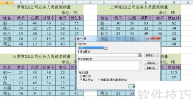 此外,若所有数据均位于同一表格内,也可采用类似方法进行合并计算。只需选定目标单元格,进入数据选项卡,点击合并计算,选择求和函数并添加相应区域,即可快速生成结果。