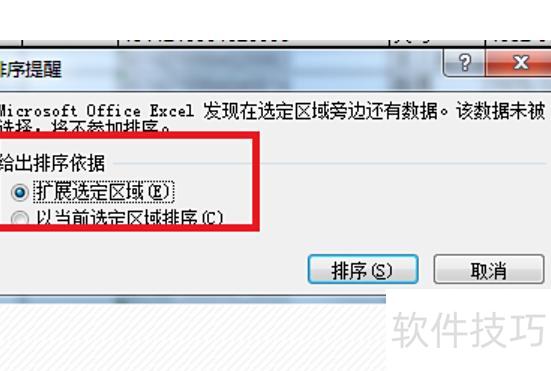 排序时需勾选扩展选定区域,否则仅对所选数列进行排序。