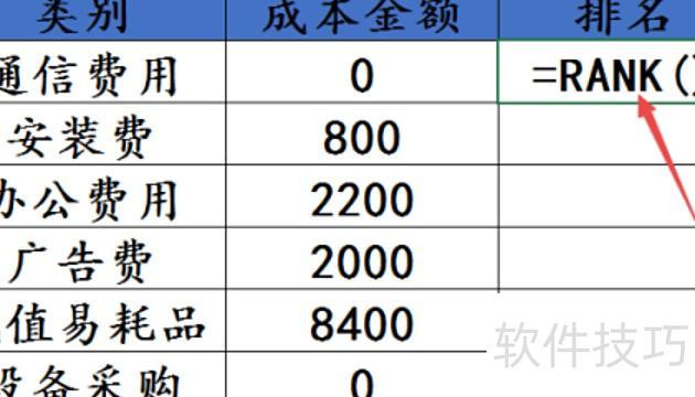 所示,RANK函数的语法为=RANK(数值,引用区域,排序方式)。其中,数值指要参与排名的具体数,引用区域为参与比较的数值范围,排序方式仅取0或1:0表示按从大到小排列,1表示按从小到大排列。