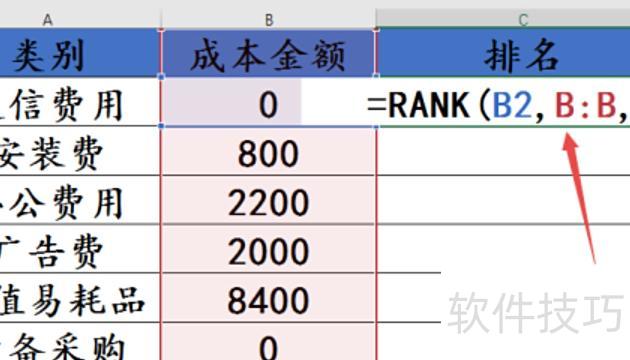 在括号中输入后按回车,或输入后按回车。其中$符号表示绝对引用,可确保始终引用B2至B9区域的数据,避免因相对引用导致排名结果出错。