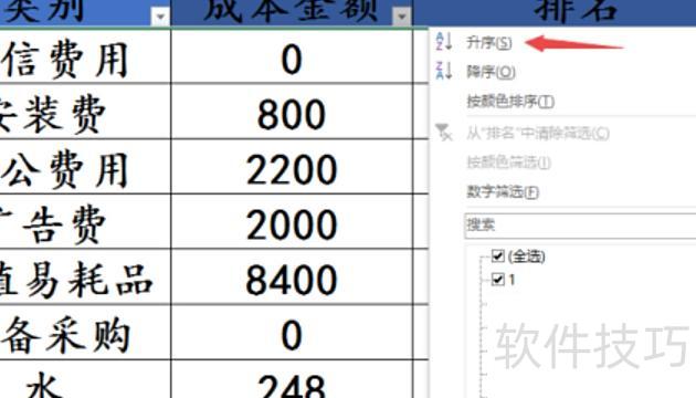 为便于查看,可对排名列使用筛选功能进行升序排列,所示。