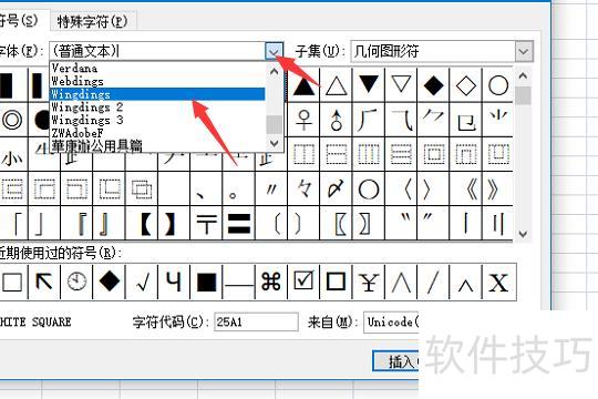 在符号对话框中,点击字体下拉箭头,选择WINGDINGS字体即可。