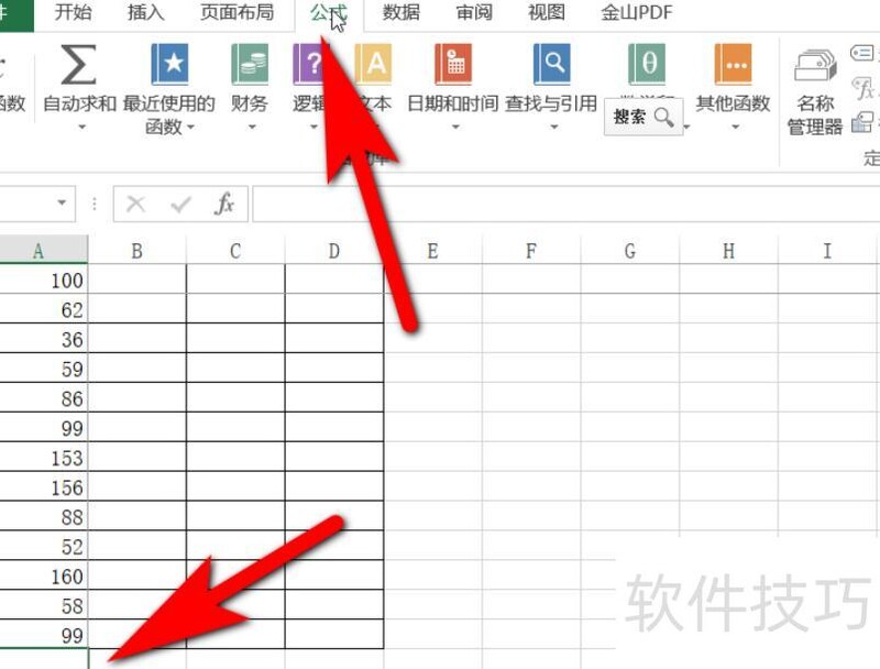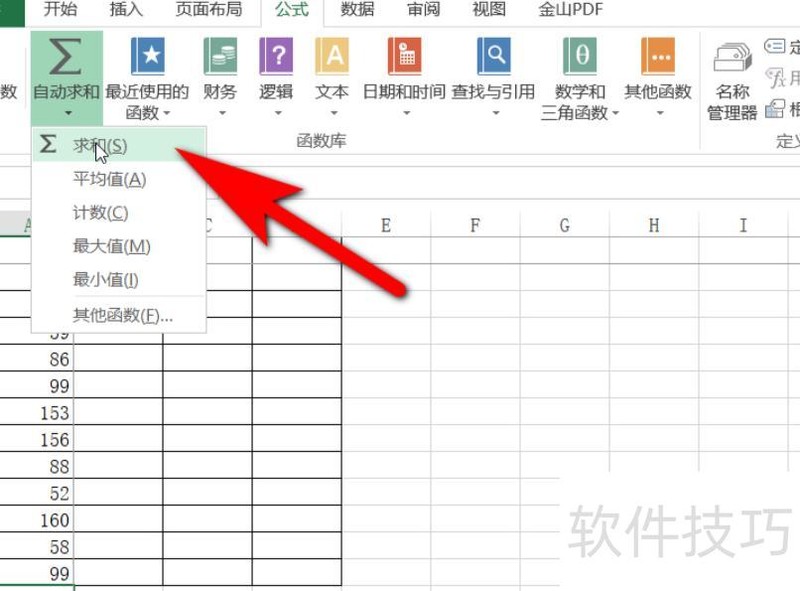 鼠标点击列下方空白单元格,输入求和结果,再点击菜单栏中的公式选项进行设置。