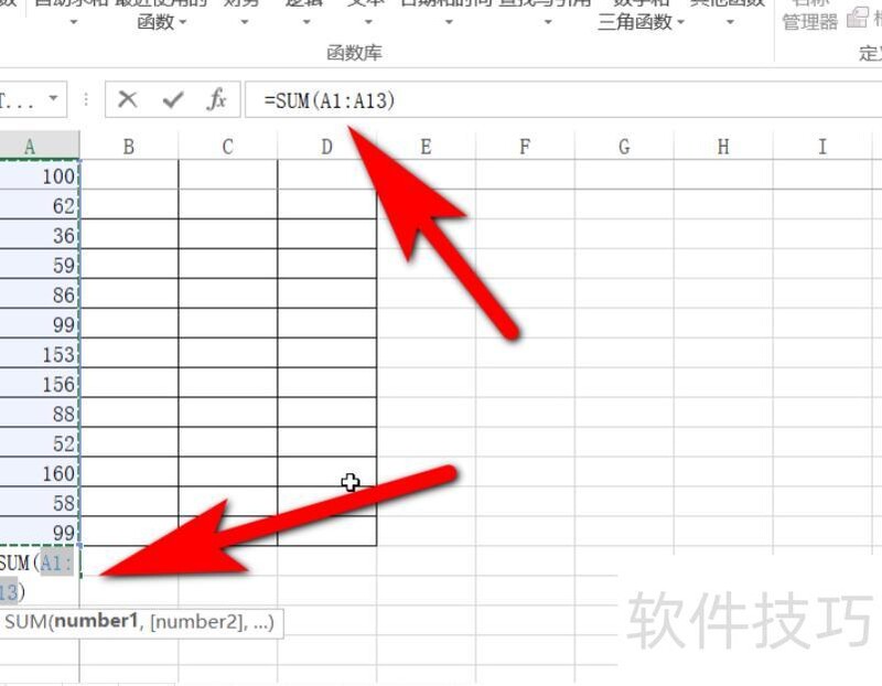 此时可看到Excel已自动选中一列数据,也可在编辑栏输入=SUM(A:A),根据实际需要调整求和范围。