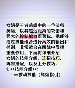 女娲怎么玩,很多玩家都想知道,这位创世女神,在峡谷里,其实是个法师,她的玩法,有点特别,手很长,视野也广,但技能需要预判,所以,玩好她,需要一点技巧,今天,我们就来聊聊,怎么把女娲玩出花样。