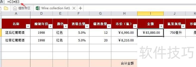 打开Excel 2010并加载需处理的文件,选中目标单元格,输入=G3*H3后按回车,即可计算出数量与单价相乘的金额结果,所示。