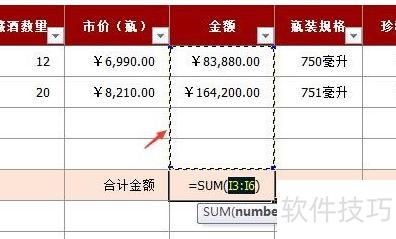 接着计算总金额,选中单元格后,点击数据工具栏中的自动求和按钮,所示。