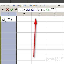 当A1至A12单元格中的数值小于或等于10时,将其显示在对应的B1至B12单元格中;若大于10,则对应B列单元格留空。该条件使用<=表示。
