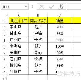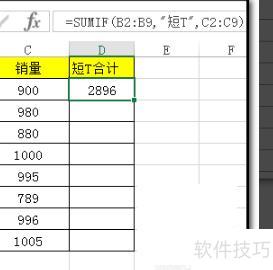 在D2单元格输入公式:=SUMIF(B2:B9,短T,C2:C9),其中短T需加双引号,按回车后即可得出短T的销量结果。