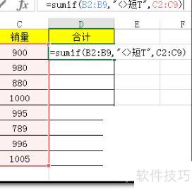 在D2单元格中输入公式=sumif(B2:B9,<>短T,C2:C9),按回车键,即可得到计算结果。