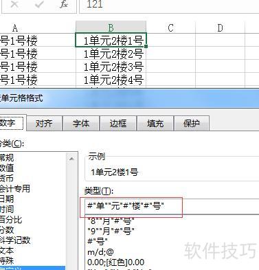右键单元格,选择自定义格式,输入单元楼号,即可将121显示为1单元2楼1号。