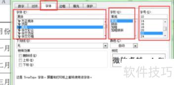 在字体选项卡中,可调整字体、字形、字号,以及下划线、颜色和特殊效果等样式,同时支持边框、填充和保护等设置,完成后点击确定即可。