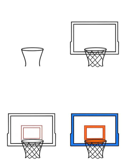 2、从篮板开始勾勒轮廓接着,我们从篮板画起,篮板通常是长方形,或者带点梯形,在篮板的下方中央,就是篮筐的位置,用轻轻的线条,画出篮板的轮廓,然后,在预定位置,画一个水平的短线,这代表篮筐的固定点,这样,篮筐就有了“根”。