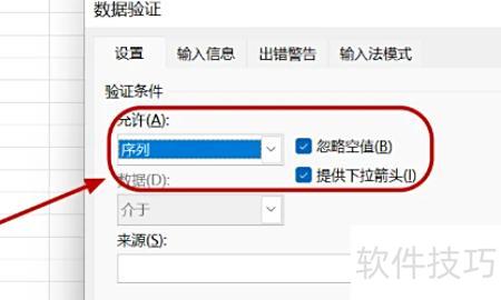 弹出数据验证窗口后,选择序列作为验证条件,并勾选忽略空值与提供下拉箭头选项。