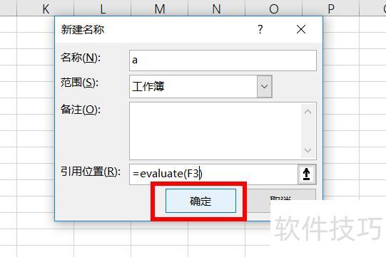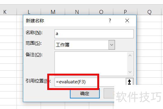 在引用位置输入=evaluate(F3),其中F3为存放公式的单元格,如红框所示。