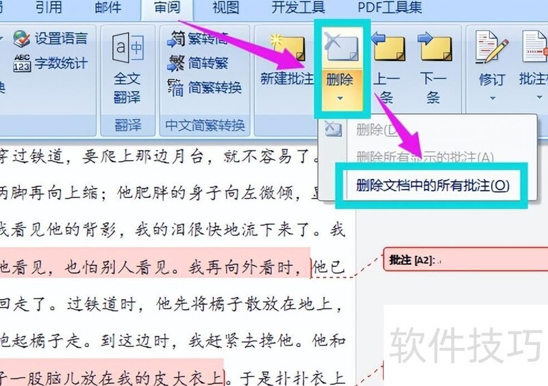 若需删除文档中全部批注,请按以下步骤操作:首先点击菜单栏中的审阅选项卡,接着在该选项卡下找到删除按钮,点击后从下拉菜单中选择删除文档中的所有批注。执行此操作即可一次性批量清除文档内所有批注内容,具体操作界面所示。
