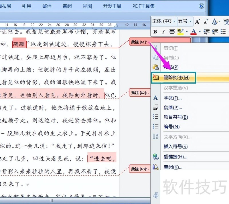 若仅需删除某一条批注,可用鼠标左键单击该批注,再点击右键,在弹出的菜单中选择删除批注即可完成操作,具体步骤所示。