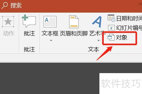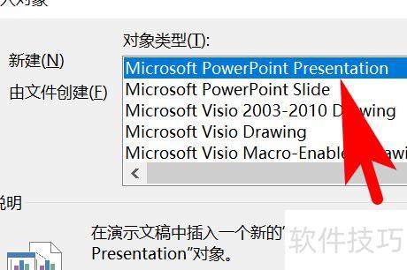 在插入菜单中选择对象,打开对话框后选中Microsoft PowerPoint演示文稿,确认即可完成插入操作。