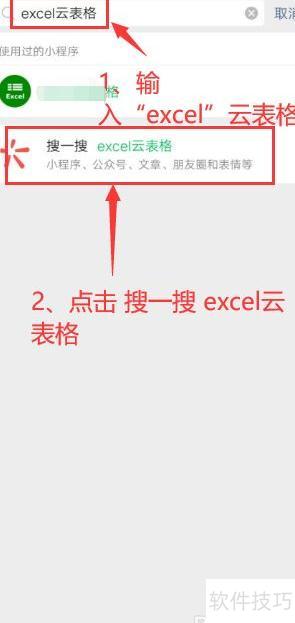 在首页右上角点击搜索图标,输入excel云表格,选择搜一搜 excel云表格,进入搜索结果页面后点击excel云表格小程序,即可打开其主页面。