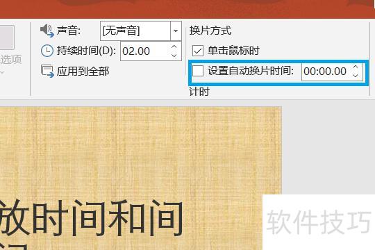 在页面中,勾选设置自动换片时间,并输入所需时长,即可设定幻灯片播放间隔。