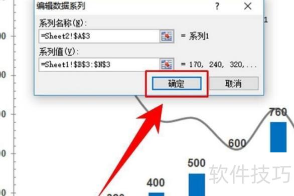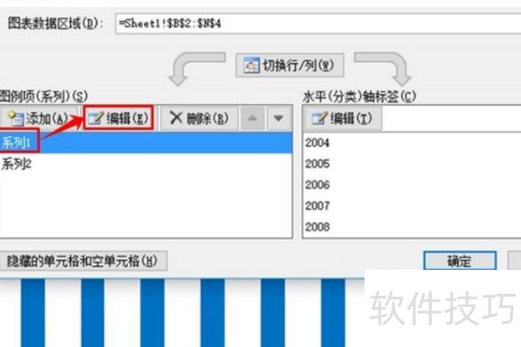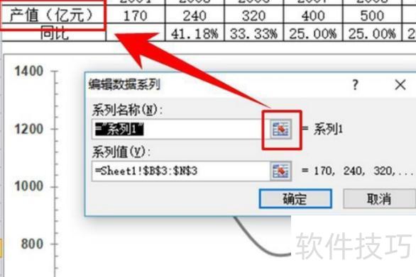 此时将弹出编辑数据系列窗口,点击图示图标,选择包含图例对应文字的单元格即可。