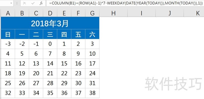 在A1单元格输入公式:=TEXT(TODAY(),YYYY年M月),使其仅显示当前年月。随后在A2至G2区域依次填入星期名称。在A3单元格中输入公式:=COLUMN(B1)+(ROW(A1)-1)*7-WEEKDAY(DATE(YEAR(TODAY()),MonTH(TODAY()),1)),然后将该公式向下拖动填充,以自动生成当月对应的日期序列,确保日期按周排列,与上方星期对应,实现动态日历效果。