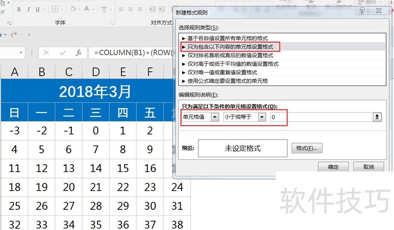 5. 再次选中A3:G8区域,设置条件格式,输入公式:=DAY(DATE(YEAR(TODAY()),MonTH(TODAY())+1,0)),以实现特定日期条件的格式化显示。
