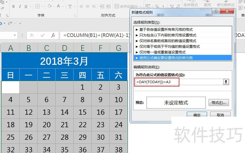 再次选中A3至G8区域,通过条件格式中的使用公式确定格式,输入公式:=DAY(TODAY())=A3,当当前日期的天数与单元格内日期相同时,自动将该单元格填充为蓝色底纹,并设置字体为白色。