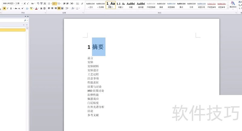性能表征为二级标题,结果与讨论、结论及参考文献均为一级,XRD讨论结果设为二级,即可高效完成多级标题设置。