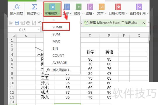 点击任务栏常用函数按钮,在下拉列表中选择SUMIF函数并点击确认。