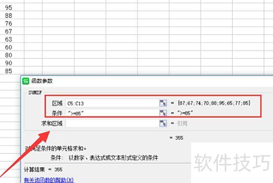 在弹出的SUMIF函数窗口中,设置相应参数:选定区域为语文成绩整列,条件输入>=85,确认后即可完成Excel中符合条件的数据求和操作。