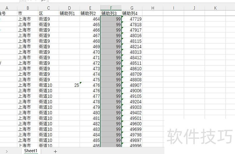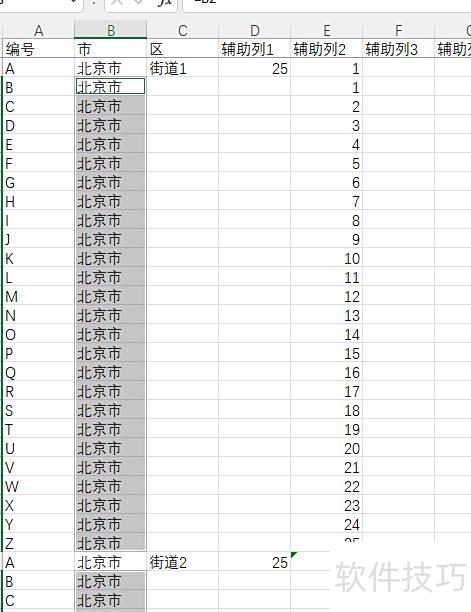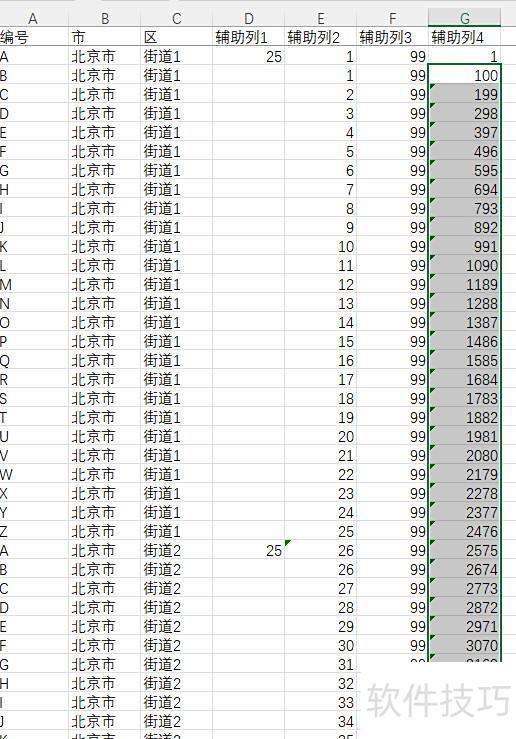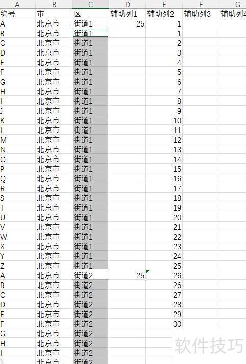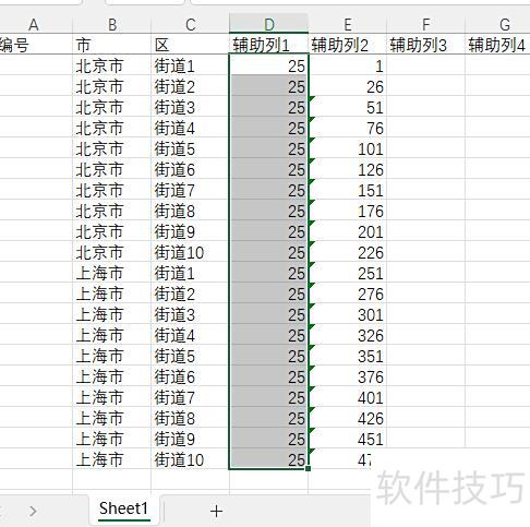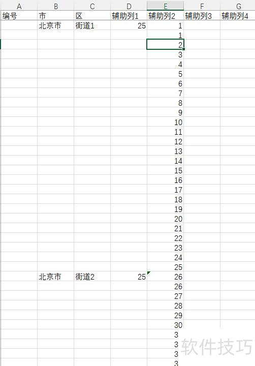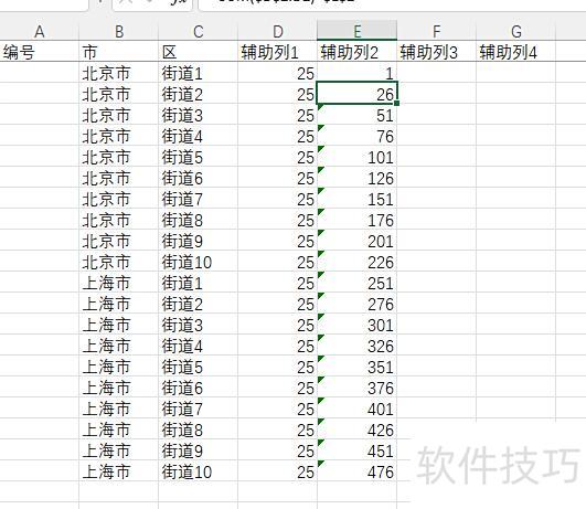 首先,所示,冻结首行,并在D列全部填入25,表示在当前行下方插入25个空行,使每个街道共占26行;然后在E1输入1,E2输入公式=SUM($D$2:D2)+$E$1,再向下填充。