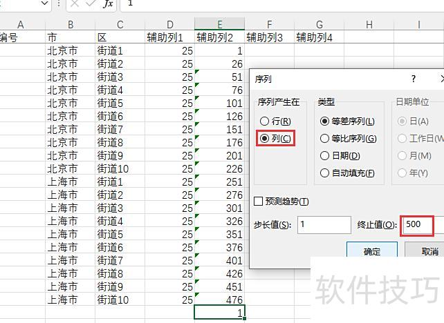 在E22单元格输入1,选择开始选项卡中的填充功能,点击序列,设置序列方向为列,终止值为500,最后点击确定完成操作。